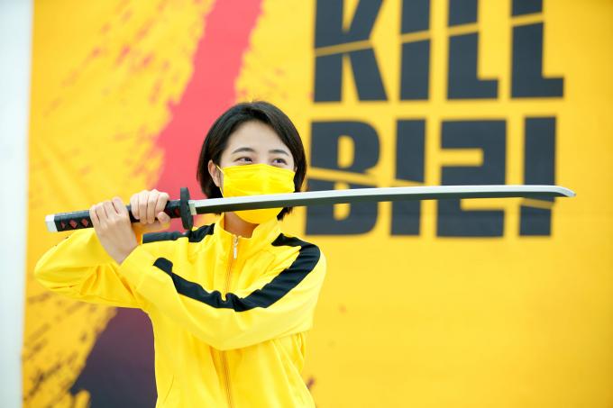 여영국 "각각의 비리 사건에 대응하는 것만으론 한계" 정의당 류호정 의원이 21일 국회에서 영화 '킬빌'에 등장하는 우마 서먼의 노란 트레이닝복 차림으로 검을 들었다.
