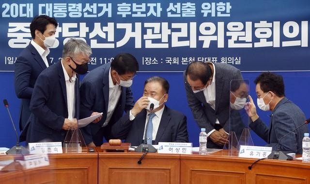 ▲ 이상민(가운데) 선거관리위원장 등 더불어민주당 관계자들이 21일 국회에서 열린 제7차 중앙당선거관리위원회의에서 얘기를 나누고 있다. [뉴시스]