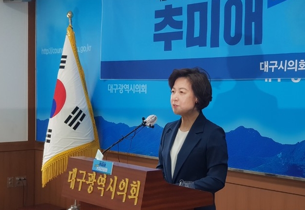 ▲더불어민주당 경선후보인 추미애 전 법무부 장관이 지난 19일 대구시의회 소회의실에서 기자회견을 열어 대구경북에 대한 비전을 발표하고 있다. [뉴시스]