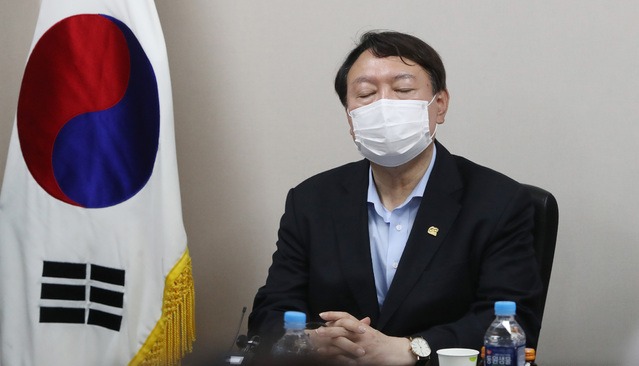 ▲ 야권 대선 주자인 윤석열 전 검찰총장이 지난 20일 대구 중구 서문시장에서 열린 '대구 경제 살리기' 간담회에서 상인회 관계자들과 얘기를 나누다 잠시 생각에 잠겨 있다. [뉴시스]