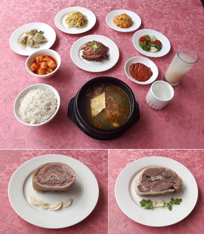 ▲ 한상차림의 단고기국밥(맨위)과 단고기등심찜, 단고기다리찜 [노동신문 캡처]