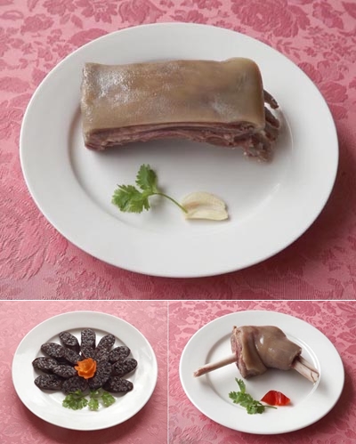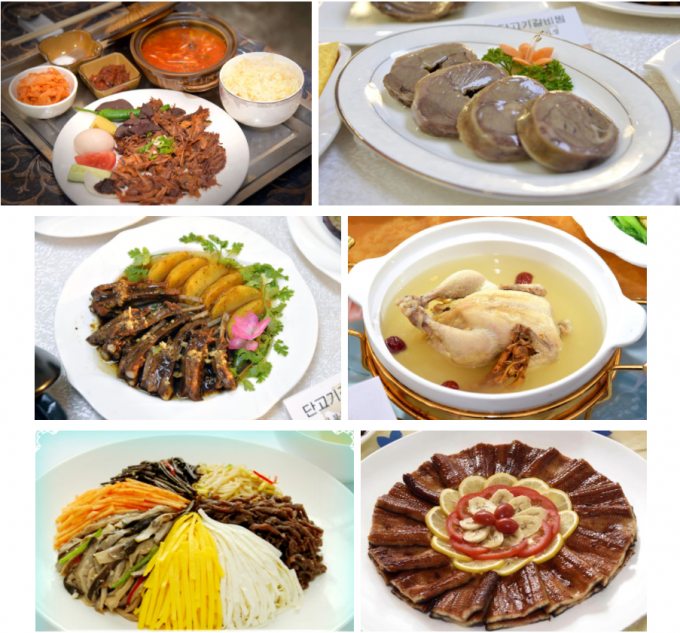 ▲ 단고기갈비찜(맨위)과 단고기순대, 단고기관절찜 [노동신문 캡처]