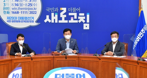 ▲더불어민주당 송영길 대표(가운데)가 26일 서울 여의도 국회에서 열린 최고위원회의에서 발언하고 있다. [뉴시스]