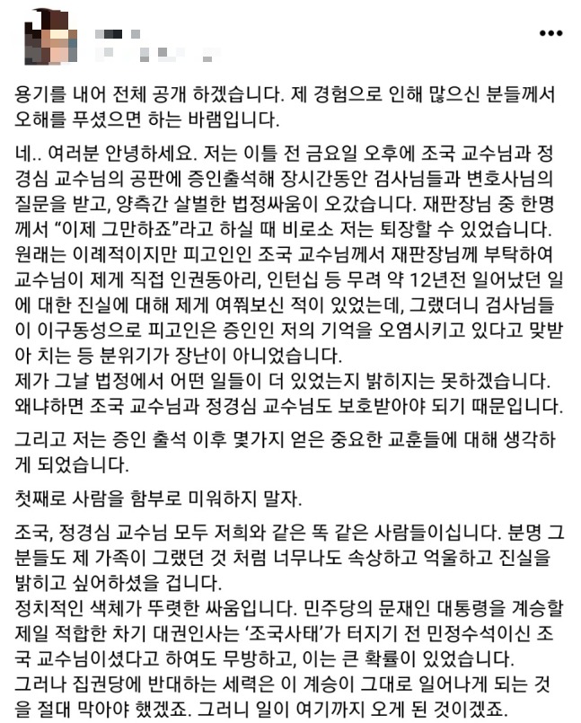 그러면서 "저의 증오심과 적개심, 인터넷으로 세뇌된 삐뚤어진 마음, 즉 우리 가족이 너희를 도와줬는데 오히려 너희들 때문에 내 가족이 피해를 봤다는 생각이 그날 보복적이고 경솔한 진술을 하게 한 것 같다"며 "의미 없는 진흙탕 싸움이 어서 끝나고 교수님의 가정도 예전과 같이 평화를 되찾았으면 더할 나위 없이 좋겠다"고 글을 맺었다.