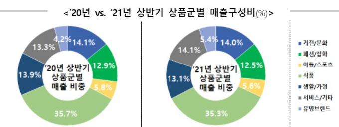 ▲ 27일 산업통상자원부가 '2021년 상반기 주요유통업체 매출동향'에 발표된 지난해와 올해 상반기 상품군별 유통 매출 구성비 [산업통상자원부 제공]