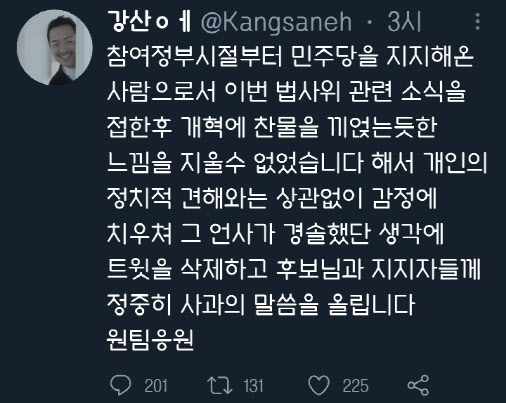 강산에는 28일 트위터에 "참여정부 시절부터 민주당을 지지해온 사람으로서 이번 법사위 관련 소식을 접한 후 개혁에 찬물을 끼얹는 듯한 느낌을 지울 수 없다"라며 "개인의 정치적 견해와는 상관없이 감정에 치우쳐 그 언사가 경솔했다는 생각에 '트윗'을 삭제하고 후보님과 지지자들에게 정중히 사과 말씀을 올린다"라고 밝혔다. 그러면서 "원팀 응원"이라고 덧붙였다.