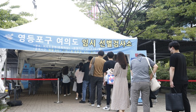 ▲ 28일 서울 여의도 공원 임시 선별검사소를 찾은 시민들이 코로나19 검사를 받기 위해 줄을 서고 있다. [뉴시스]