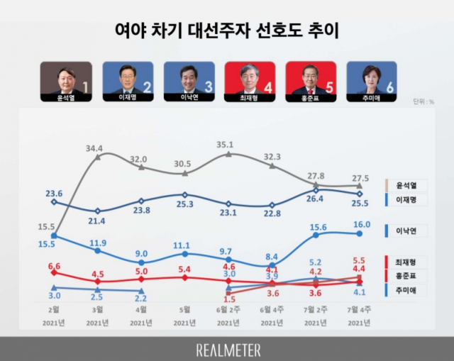 최근 고전을 면치 못하던 윤석열 전 검찰총장의 지지율 하락세가 둔화하면서 이재명 경기지사와 오차범위 내 접전 중인 것으로 조사됐다. 더불어민주당 이낙연 전 대표는 3위를 유지했고, 최재형 전 감사원장은 처음으로 4위로 올라섰다.