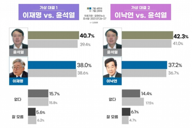 尹 40.7% vs 이재명 38%…尹 42.3% vs 이낙연 37.2%