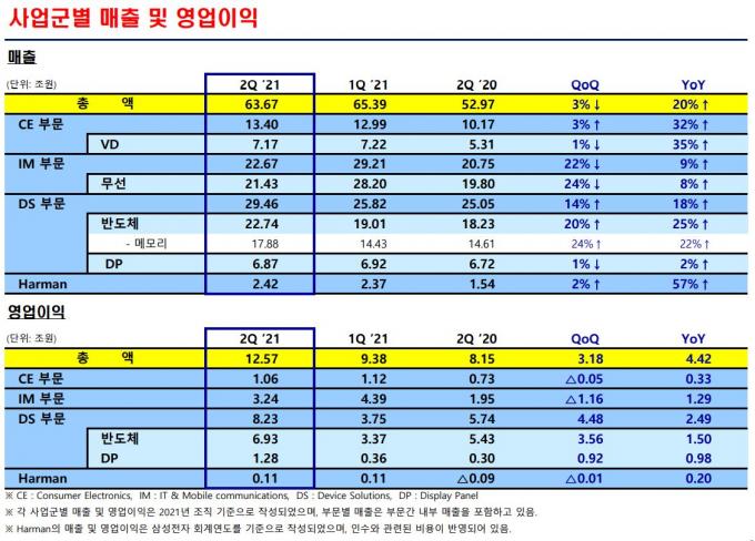 사업별 실적을 보면 반도체는 2분기 매출 22조7400억 원, 영업이익 6조9300억 원을 달성해 직전 분기와 전년 동기 대비 실적이 대폭 개선됐다. 영업이익의 경우 전사 실적의 절반 이상을 책임져 '깜짝 실적'(어닝 서프라이즈)을 견인했다.