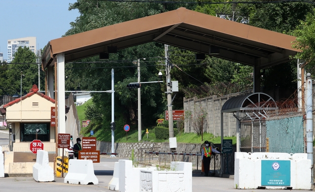 ▲29일 오전 서울 용산구 미군기지 입구에 근무자들이 출입 차량을 통제하고 있다. [뉴시스]