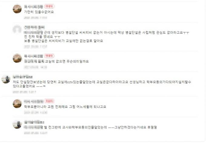 경기지역의 한 맘카페 회원들도 이구동성으로 공립유치원의 미설치 행태를 비판하며 제도적 보완을 촉구했다. 한 맘카페 회원은 "병설단설 CCTV 없는 거 아시는 데 사립처럼 관심도 없더라고요 ㅜㅜ" 라고 우려를 표명했고 다른 회원은 "(전체 동의를 받아야 한다는 것은) 그냥 안하겠다는 거네요 후덜덜"이라고 글을 올렸다.
