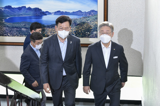 ▲ 더불어민주당 송영길 대표(오른쪽 두 번째)와 이재명 경기지사(오른쪽)가 지난달 20일 경기 수원 팔달구 경기도청에서 열린 '경기도-더불어민주당 예산정책협의회'에 참석하기 위해 이동하고 있다. [뉴시스]