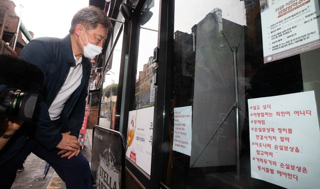 ▲ 국민의힘 대선주자인 최재형 전 감사원장이 지난 1일 서울 용산구 이태원 세계음식거리에서 휴업한 가게에 붙어있는 문구를 읽고 있다. [뉴시스]