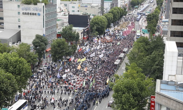 민주노총은 지난달 3일 서울 종로 일대에서 약 8000명이 참여한 대규모 집회를 열었다. 당초 집회는 여의도에서 열릴 예정이었으나, 경찰이 여의도 일대를 봉쇄하자 장소가 변경됐다.