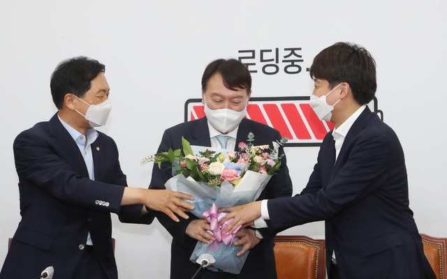 ▲ 국민의힘 이준석 대표(오른쪽)와 김기현 원내대표(왼쪽)가 2일 서울 여의도 국회에서 열린 입당 환영식에서 윤석열 전 검찰총장(가운데)에게 꽃다발을 주고 있다. [뉴시스]