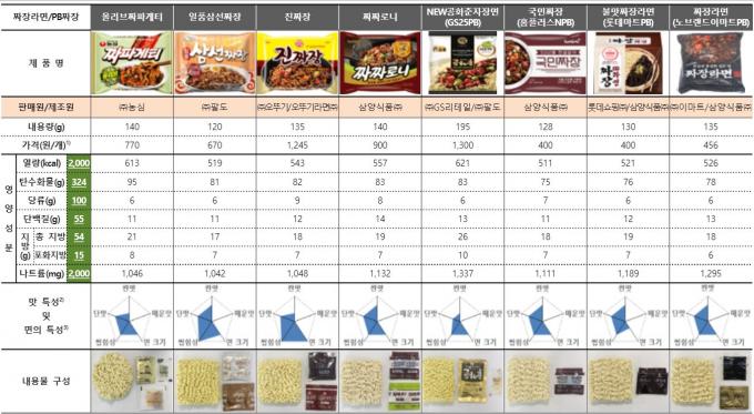 짜장라면 평가 대상은 △농심 올리브짜파게티 △팔도 일품삼선짜장 △오뚜기 진짜장 △삼양식품 짜짜로니 △GS25 뉴(NEW) 공화춘자장면 △홈플러스 국민짜장△롯데쇼핑 불맛짜장라면 △노브랜드 짜장라면 등이다.