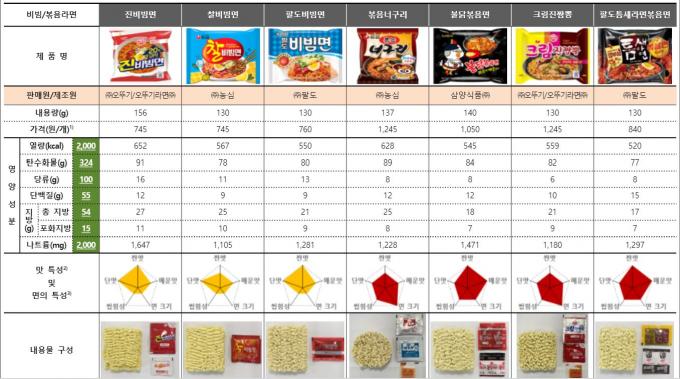 ▲ 비빔·볶음라면 제품들의 영양성분과 맛·면 특성, 내용물 구성 [한국소비자원 자료]