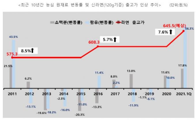 3일 한국소비자단체협의회 물가감시센터는 주요 원재료 가격의 변동 추이와 농심의 재무제표 분석 등을 통해 가격 인상 타당성을 살펴본 결과, 라면 주요 원재료값은 2011년 이후 2020년까지 연평균 소맥분 -2.0%, 팜유 -5.9% 줄었으나, 농심의 신라면 출고가는 2011년부터 올해까지 3회에 걸쳐 평균 7.3% 인상했다고 밝혔다.