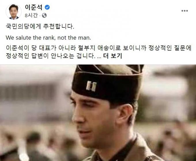 국민의힘 이준석 대표는 4일 국민의당 안철수 대표를 직격했다. 이 대표는 이날 페이스북에 "국민의당에게 추천한다"며 2001년 미국 히트작인 '밴드 오브 브라더스'에 나오는 대사를 소개했다. "We salute the rank, not the man(계급에 경례하는 것이지 사람을 보고 하는 건 아니다)"는 내용이다.