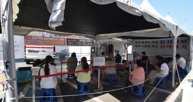 ▲ 4일 오전 대구 수성구 보건소 선별진료소를 찾은 시민들이 검사를 받기 위해 대기하고 있다. [뉴시스]