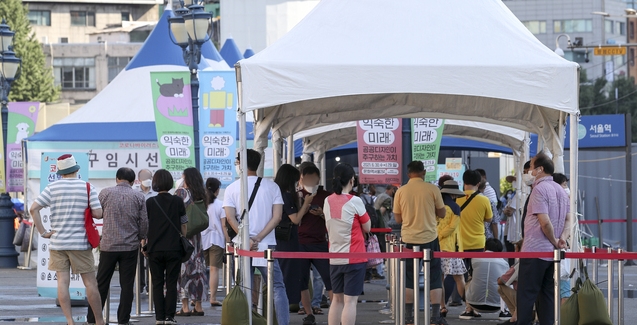 ▲ 지난 7일 오전 서울 중구 서울역광장에 설치된 코로나19 임시선별검사소를 찾은 시민들이 검사를 받기 위해 줄 서 있다. [뉴시스]