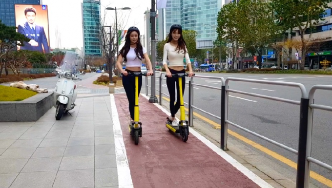 ▲ 안전모를 착용한 모델들이 전동킥보드를 타고 있다. [하이킥 제공]