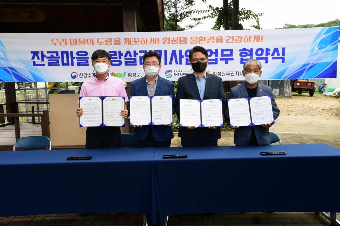 장신상 횡성군수는 9일 오전 갑천면 매일3리 마을회관에서 잔골천 도랑살리기 업무협약을 위해 최광순 매일3리 이장, 이형묵 K-water 횡성원주권지사장, 홍성범 횡성환경운동연합의장과 4자 협약식을 개최했다.