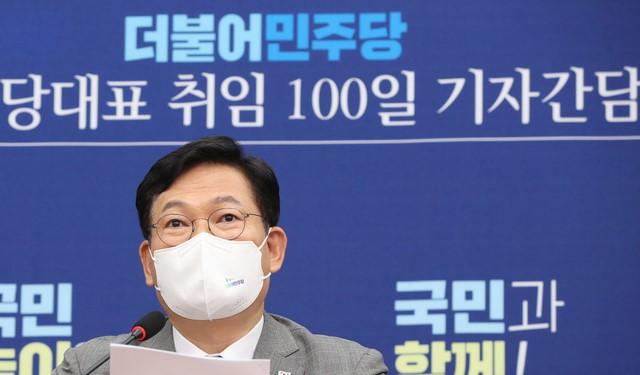 송 대표는 이날 서울 여의도 국회에서 열린 취임 100일 기자간담회에서 "후보뿐만 아니라 각 캠프 대변인 등이 원팀협약식의 취지에 따라줘야 하고 열성 지지자들이 배설물처럼 쏟아내는 말들을 공식 발언으로 올라오지 않도록 관리해야 한다"고 주문했다.