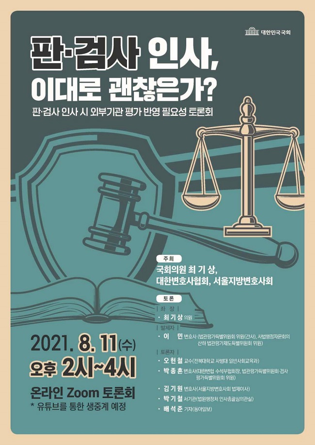 11일 최기상 더불어민주당 국회의원과 대한변호사협회의 주최로 '판·검사 인사 시 외부기관 평가 반영 필요성-판·검사 인사, 이대로 괜찮은가' 온라인 토론회가 열렸다.