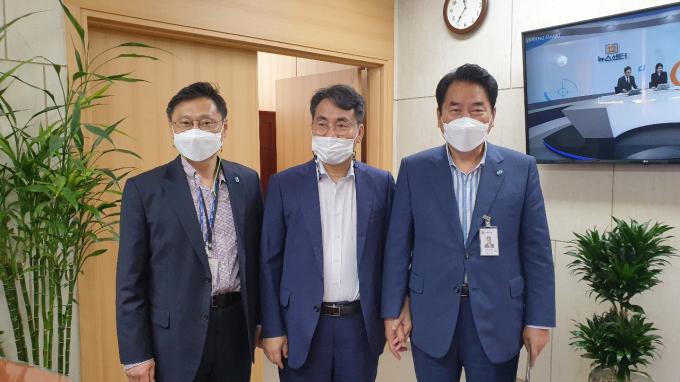 ▲ 백군기 용인시장(오른쪽)이 지난달 5일 이재영 행정안전부 차관(가운데·지난 5일 퇴임)과 기흥구 분구에 대한 면담에 앞서 기념촬영을 하고 있다. [용인시 제공]