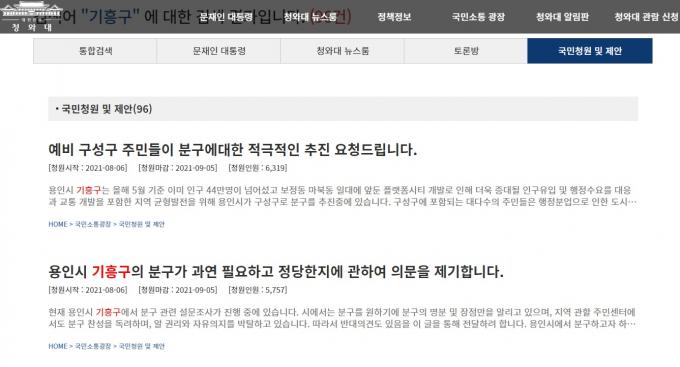 ▲ 청와대 국민청원 게시판에 올라온 용인시 기흥구 분구 찬반글 [청와대 국민청원 게시판 캡처]