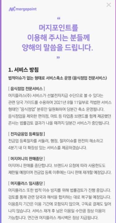 지난 11일 머지포인트 운영사인 머지플러스는 공지를 통해 "당사의 서비스가 선불전자지급 수단으로 볼 수 있다는 당국 가이드를 수용해 11일부로 적법 서비스 형태인 '음식점업' 분류만 일원화하여 당분간 축소 운영한다"고 밝혔다. 또한 음식점업을 제외한 타 업종 서비스는 법률검토 결과가 나오기 전까지 서비스를 일시중단한다고 공지했다.