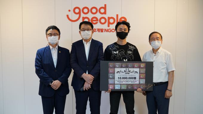 ▲ (왼쪽부터) 정권삼 굿피플 운영부회장, 김재옥 동원F&B 대표이사, EDM 아티스트 배드보스, 강대성 굿피플 상임이사가 지난 11일 서울 영등포구 굿피플 빌딩에서 열린 후원금 전달식에서 기념 사진을 촬영하고 있다. [동원그룹 제공]