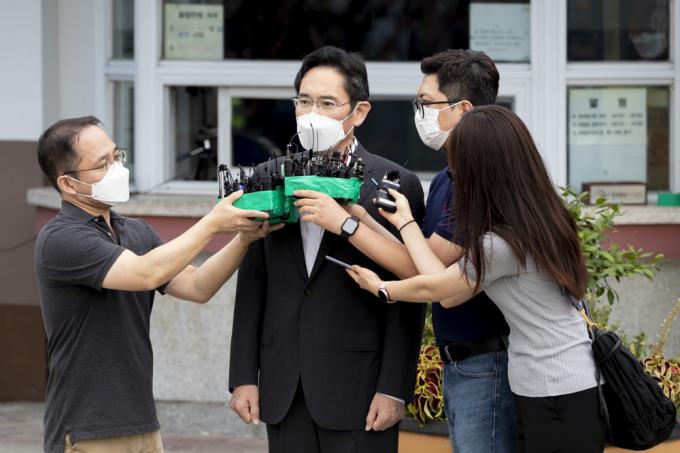 ▲ 광복절을 앞두고 가석방된 삼성전자 이재용 부회장이 13일 오전 서울구치소에서 나오며 취재진 질의에 답하고 있다. [문재원 기자]