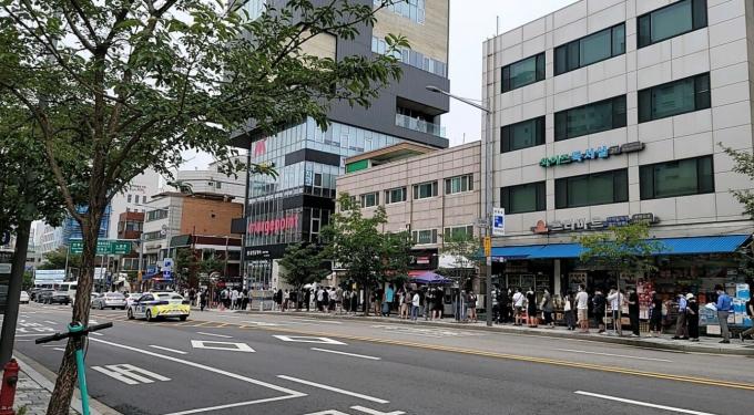 ▲ 13일 오전 포인트 환불을 요구하기 위해 머지포인트 본사 앞에 줄지어 서있는 이용자들. [SNS 캡처]