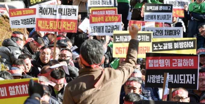 ▲ 2019년 12월 4일 오후 대구 수성구 지산동 교통연수원 앞에서 카카오T 블루 반대 집회에 참석한 택시노조원들이 피켓을 들고 구호를 외치고 있다. [뉴시스]