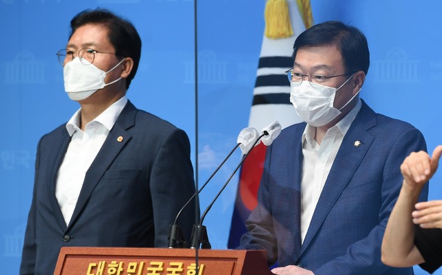 ▲ 국민의힘 정점식 의원(오른쪽)이 13일 오후 서울 여의도 국회 소통관에서 '당대표는 정권교체를 위한 공정한 경선관리에 최선을 다해야 한다'는 재선의원 성명서를 발표하고 있다. [뉴시스]