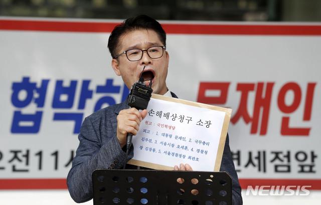 ▲ 12일 오전 서울 종로구 동화면세점 앞에서 국민혁명당 고영일 부대표가 '8·15 국민 걷기 운동'과 관련한 기자회견을 하고 있다. [뉴시스]