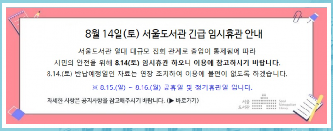 서울도서관은 13일 홈페이지에 올린 공지를 통해 긴급 임시휴관을 알렸다. 서울도서관 측은 공지에서 "서울도서관 일대 대규모 집회 관계로 출입이 통제됨에 따라 시민의 안전을 위해 14일 임시 휴관하니 이용에 참고하시길 바란다"고 밝혔다.