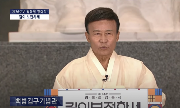 ▲ 15일 옛 서울역사(문화역서울 284)에서 열린 제76주년 광복절 경축식에서 기념사 하는 김원웅 광복회장. 지난 13일 백범김구 기념관에서 사전 녹화한 것이다. [유튜브 캡처]