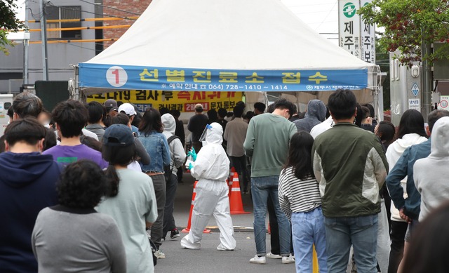 ▲ 지난 5월 11일 제주시 보건소에 코로나19 검사를 받으려는 시민들이 줄 지어 서 있다. [뉴시스]