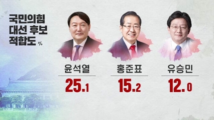 국민의힘 대선후보 적합도에선, 윤석열 전 검찰총장 25.1, 홍준표 의원 15.2, 유승민 전 의원이 12%였고, 이어 최재형 전 감사원장 4.6, 원희룡 전 제주지사 4, 하태경 의원 1.1%로 조사됐다.