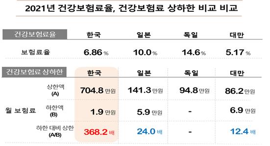 건강보험료 상하한 격차의 변화 역시 우리나라는 2017년 278.9배에서 2021년 368.2배로 급증한 반면 일본은 24배로 동일했고, 대만은 14.1배에서 12.4배로 오히려 낮아졌다.
