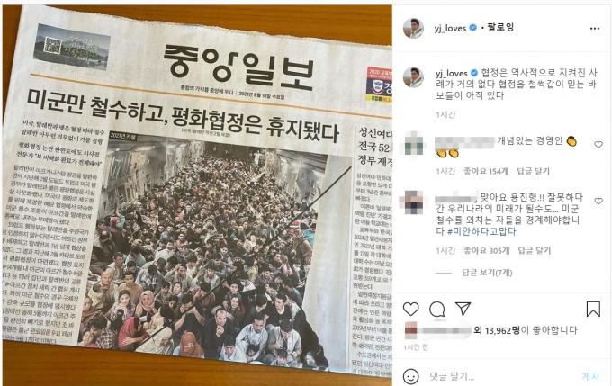▲ 19일 정용진 신세계그룹 부회장이 미국-탈레반 평화협정 사문화 관련 기사 사진과 함께 글을 올렸다. [정용진 부회장 인스타그램 캡처]