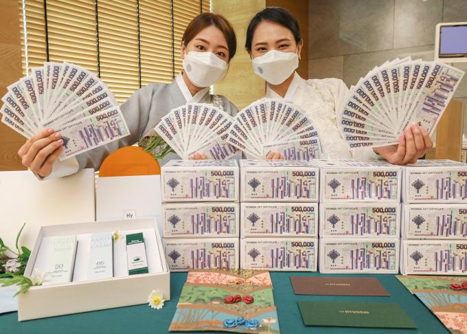 ▲ 19일 오전 경기도 성남시에 위치한 현대백화점 판교점에서 모델들이 명절 상품권을 소개하고 있다. [현대백화점그룹 제공]