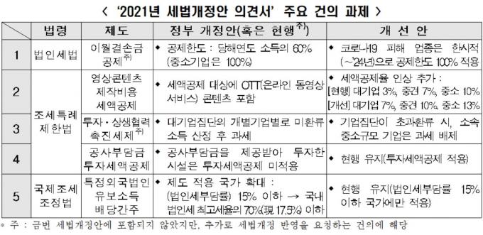 한경연은 기업들이 차입 등을 통해 확보한 유동성의 상당 부분을 투자가 아닌 세금에 투입해야 하는 상황이라며 코로나19로 경영에 심각한 피해를 입은 모든 기업에 대해 2024년까지 이월결손금 공제한도를 소득의 100%까지 확대해 달라고 건의했다.