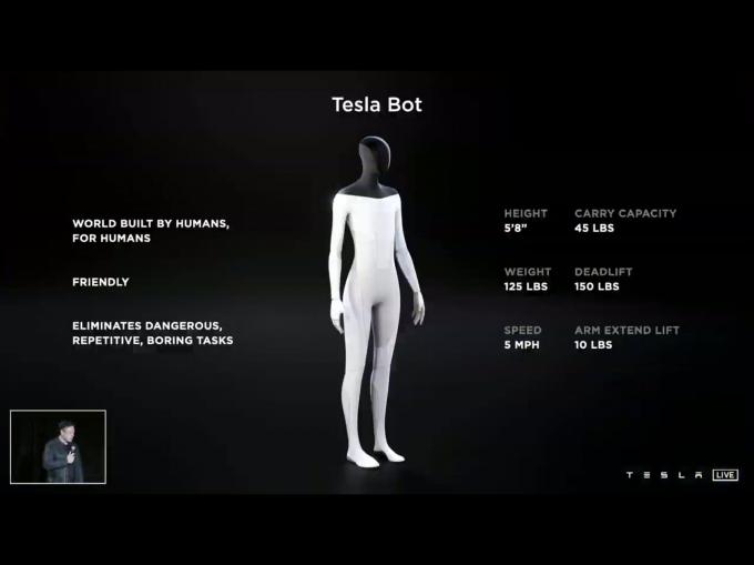 테슬라봇은 테슬라 기술의 총체가 될 전망이다. 머리쪽에는 테슬라의 주행보조장치인 오토파일럿용 카메라가 들어가서 주요 정보를 파악할 수 있다. 또 로봇의 심장은 테슬라 완전자율주행(FSD)의 하드웨어를 탑재하고 있다.