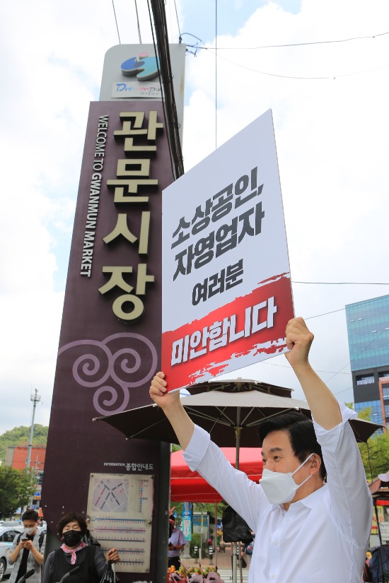 원 전 지사는 이날 첫 일정으로 대구의 대표적 민주화의 상징인 대구민주화운동기념보존회를 방문했다. 이어 관문시장, 월배시장, 서남시장에서 소상공인·자영업자를 위한 1인 시위를 계속했다.