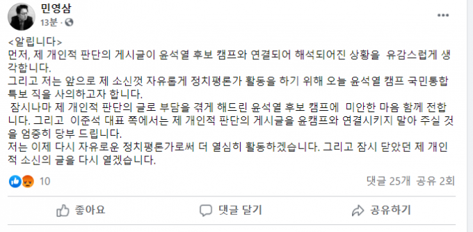 이어 이날 페이스북 게시글을 통해  "개인적 판단의 게시글이 윤석열 후보 캠프와 연결되어 해석되어진 상황에 유감스럽다"고 밝혔다.